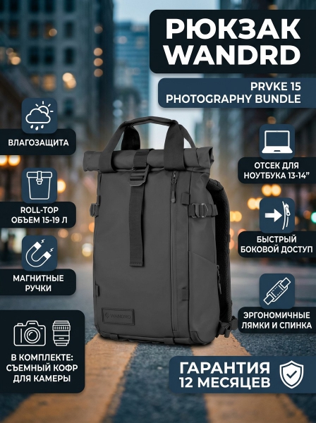 Рюкзак WANDRD PRVKE 15 Photography Bundle, черный, 15 л. - ОписаниеРюкзак WANDRD PRVKE 15 Photography Bundle – это идеальный рюкзак на каждый день. Всем известная и отмеченная наградами серию PRVKE и адаптированная под повседневное использование, вот и получился PRVKE 15 Photography Bundle — компактный и максимально функциональный рюкзак на каждый день. Обновленный дизайн выполнен в современном монохромном стиле: лаконичный внешний вид, ремни и скручивающийся верх выполнены в одном цвете с корпусом — стиль и практичность в идеальном балансе. Для максимального комфорта рюкзак получил новую форму, а также улучшенные плечевые лямки и спинку с дышащими мягкими вставками. Он обеспечивает эргономичную посадку и удобно сидит на любой фигуре. Практичность на высоте: верхний карман с молнией позволяет быстро достать необходимые мелочи, не разворачивая верхний клапан. Внутри вас ждет продуманная организация: отдельный отсек для ноутбука, внутренние карманы для аксессуаров и два внешних кармана для бутылок с водой. WANDRD PRVKE 15 Photography Bundle — это стиль, комфорт и порядок в одном рюкзаке. Создан для тех, кто ценит удобство в каждый момент дня. Рюкзак WANDRD PRVKE 15 Photography Bundle, который вы знаете и любите, стал еще лучше и создан для того, чтобы быть с вами на каждой съемке, в каждом приключении.
