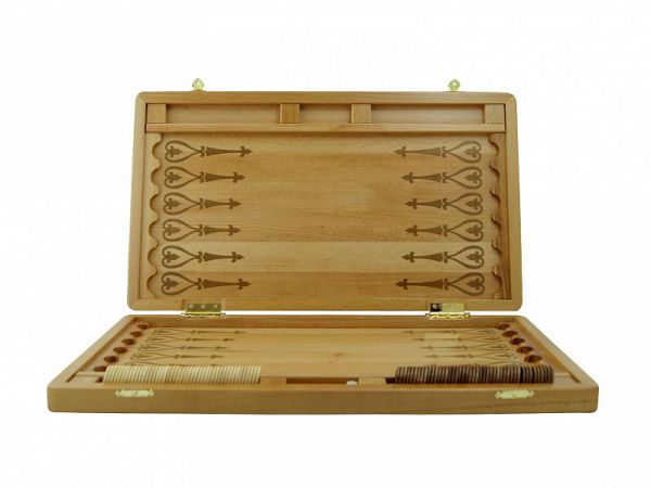 Крышка доски украшена абстрактным резным узором и покрыта защитным лаком. Ее части скреплены между собой качественной медной фурнитурой, устойчивой к износу. С внутренней стороны – поле для нард. На его бортиках предусмотрены специальные выемки под безопасное хранение фишек, поэтому можно не переживать, что они повредятся или растеряются.