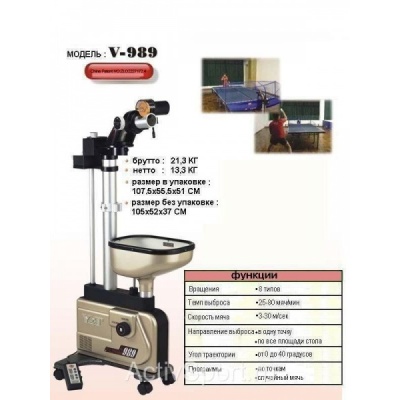 Напольный робот Y&T V-989 - ОписаниеV-989 Robot сделан из алюминиевого сплава, качественной стали и прочной пластмассы Робот сконструирован таким образом, что шары подаются в корзину автоматически. Роботом легко управлять. Отличительной чертой робота является то, что подача мячей осуществляется непрерывно, мячи не застревают в трубе подачи мячей. Подходит для индивидуальной игры, игры семьей а также в школах, клубах.