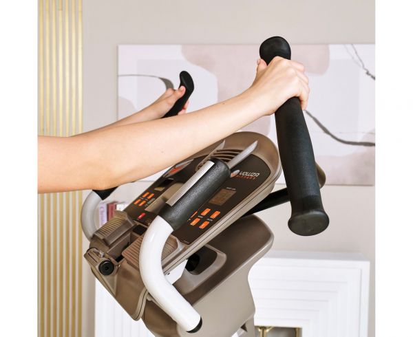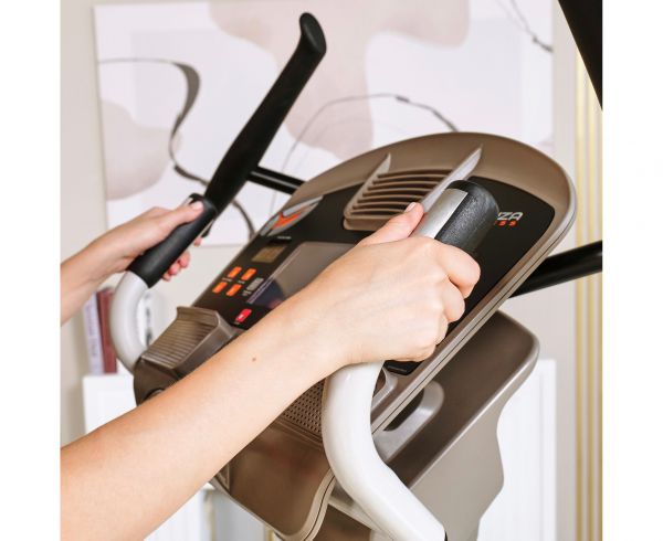 Главное достоинство станция 950 в том, что данная модель позволяет сразу тренировать мышцы как верхней, так и нижней части тела. Это достигается благодаря подвижным педалям и двигающимся рукояткам. Пользователь во время занятия совершает не только шаги по эллиптическому радиусу, но и круговые движения руками, нагружая при этом грудную клетку и мышцы пресса.