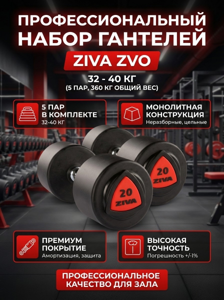 Набор из 5 пар обрезиненных гантелей ZIVA серии ZVO, 32 - 40 кг (шаг 2 кг), красная вставка - ДоставкаДоставка по Санкт-Петербургу: бесплатно, 2-3 дня Доставка по России: стоимость уточняйте у оператора. Набор из 5 пар обрезиненных гантелей ZIVA серии ZVO, 32 - 40 кг (шаг 2 кг), красная вставка - Отзывы0.0