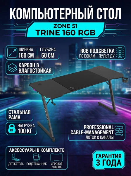 Стол компьютерный ZONE 51 Trine 160 RGB Black - БрендСтрана бренда: КНР Премиальность бренда:Стол компьютерный ZONE 51 Trine 160 RGB Black - Характеристики